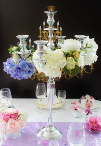 Un centre de table classique et romantique par excellence : le grand chandelier argenté version princesse, 5 branches pour bougies flambeaux à prévoir* . Hauteur 80 cm.  A rendre sans traces de bougies.