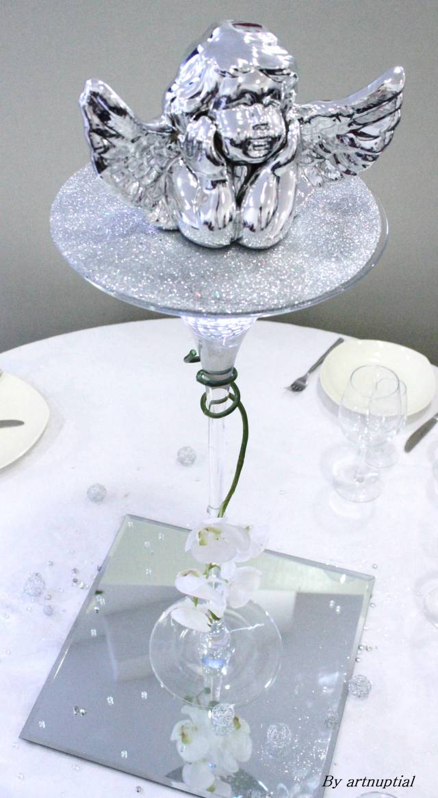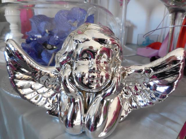 Angelot en céramique argenté laqué effet miroir, visage posé dans les mains et ailes déployées. Il se pose selon vos envies sur un centre de table, perché en haut d’un vase martini ..