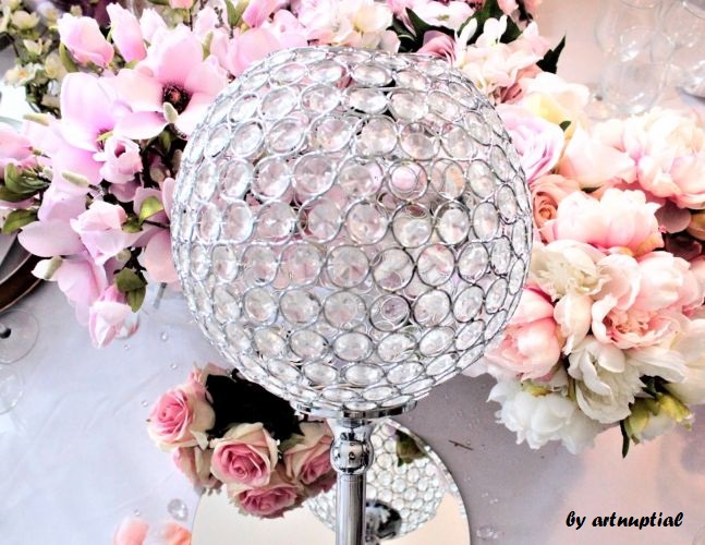 Photophore argenté avec boule de strass XXL. Hauteur totale 1 m – diamétre de boule strass 26 cm. Utiliser des bougies leds ou bougies boules avec un support pour éviter d‘endommager la base. Un vrai bijoux à lui seul ! Se demonte en 4 parties pour un transport facile.