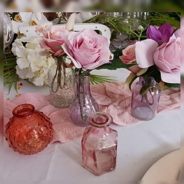 Pack 5 flacons bouteilles vintage style apothicaire en verre : différentes tailles et styles en harmonie pour réaliser un joli centre de table. Idéal pour un thème champêtre vintage, amusez vous à répartir une foultitudes de flacons variés pour créer un chemin de table « floral brocante » original.