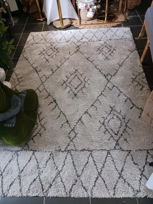 Tapis 2m30 x1m60 ultra doux/ ultra épais à poser dedans / dehors pour créer votre coin détente. Motifs graphiques gris style tapis berbère, laine couleur crème écrue. Inspiré des tapis berbères, il apporte une touche « cozy » à votre coin détente. Optez pour le salon de jardin « chill » pour un look parfait, vos invités pourront se détendre le temps d’un vin d’honneur.